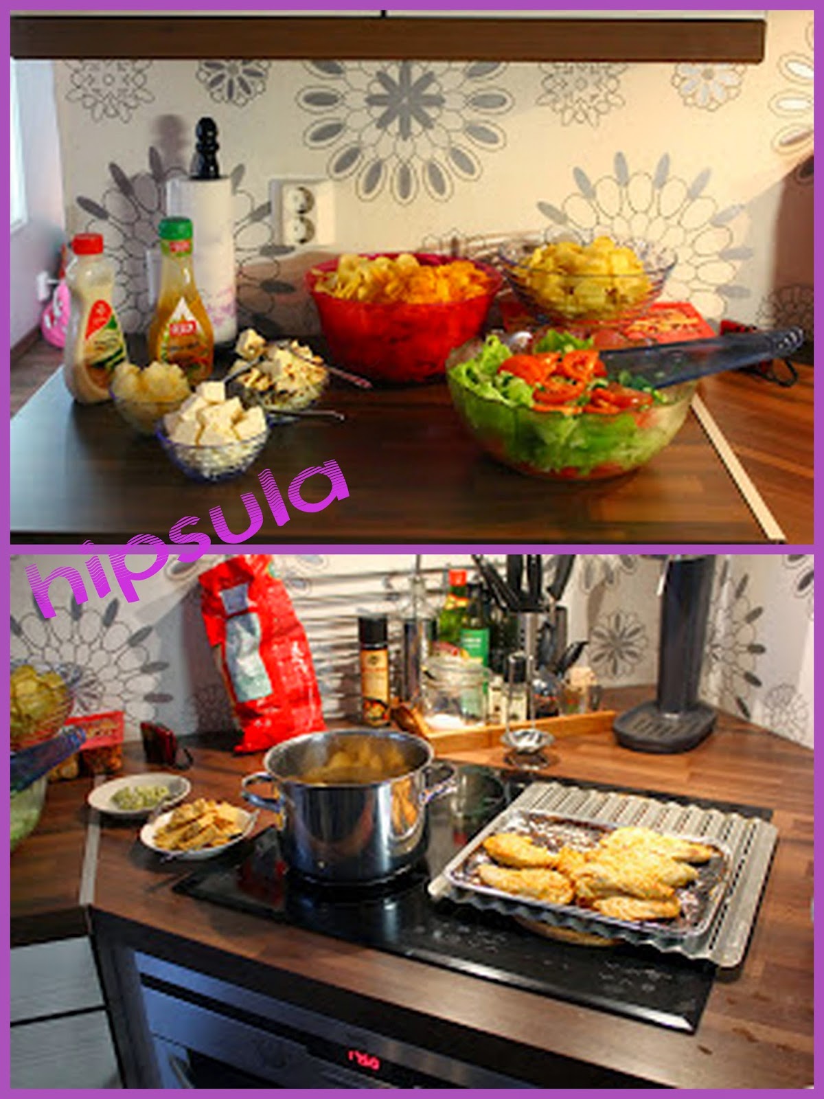 Tältä siis meiän ruokailut näyttää yleensä.. (nämä kuvat on kyllä polttareista, mutta raaka-aineet on aivan samat ku meillä yleensä.. Kanaa, uusia perunoita, maustevoita (itse tehtyä tottakai!) iso kippo salaattia + lisukkeita! Ilman noita pursuavia sipsikuppeja kuitenkin... ;) )